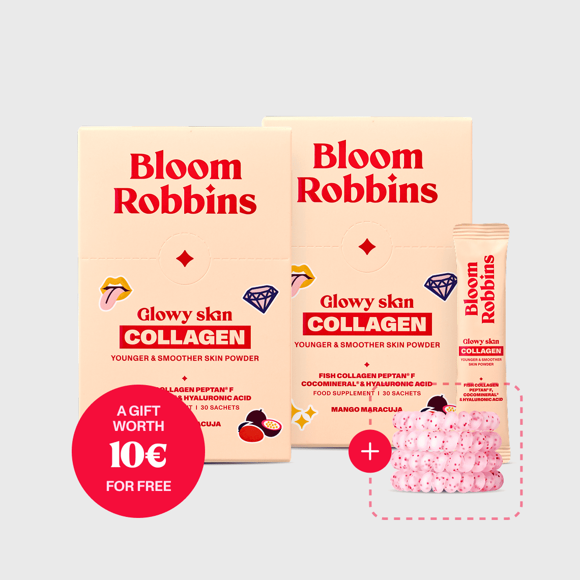 Fish collagen peptides Peptan®, acidity regulator (citric acid), inulin, coconut water powder CocoMineral®, flavouring, sodium hyaluronate, vitamin C (L-ascorbic acid), beetroot concentrate, sweetener (sucralose)