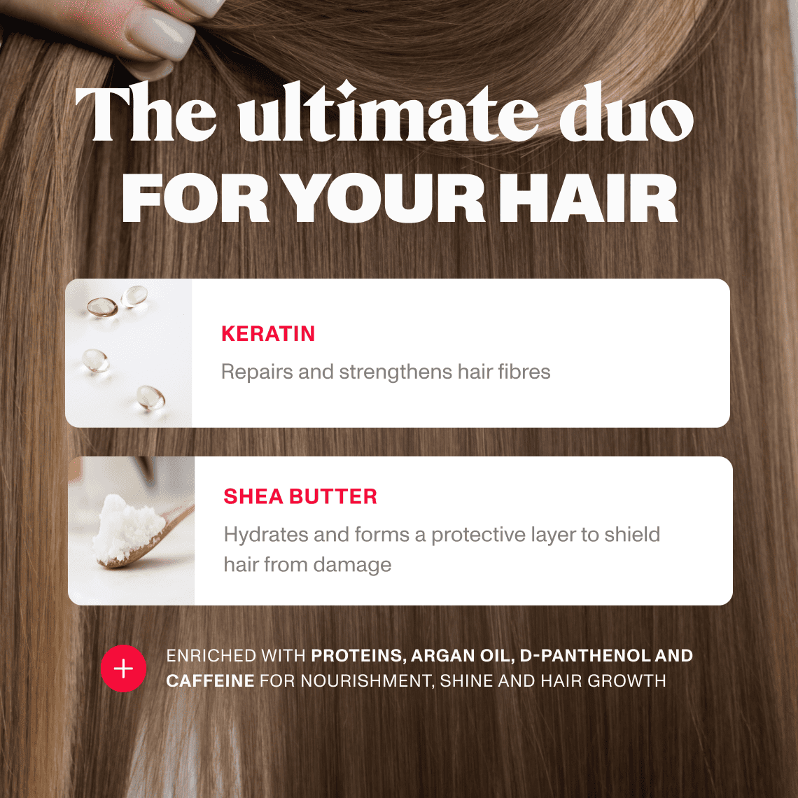 Blended with argan oil, D-panthenol and caffeine, this powerful duo restores, nourishes and protects — leaving your hair softer, stronger and glowing with salon-worthy shine.