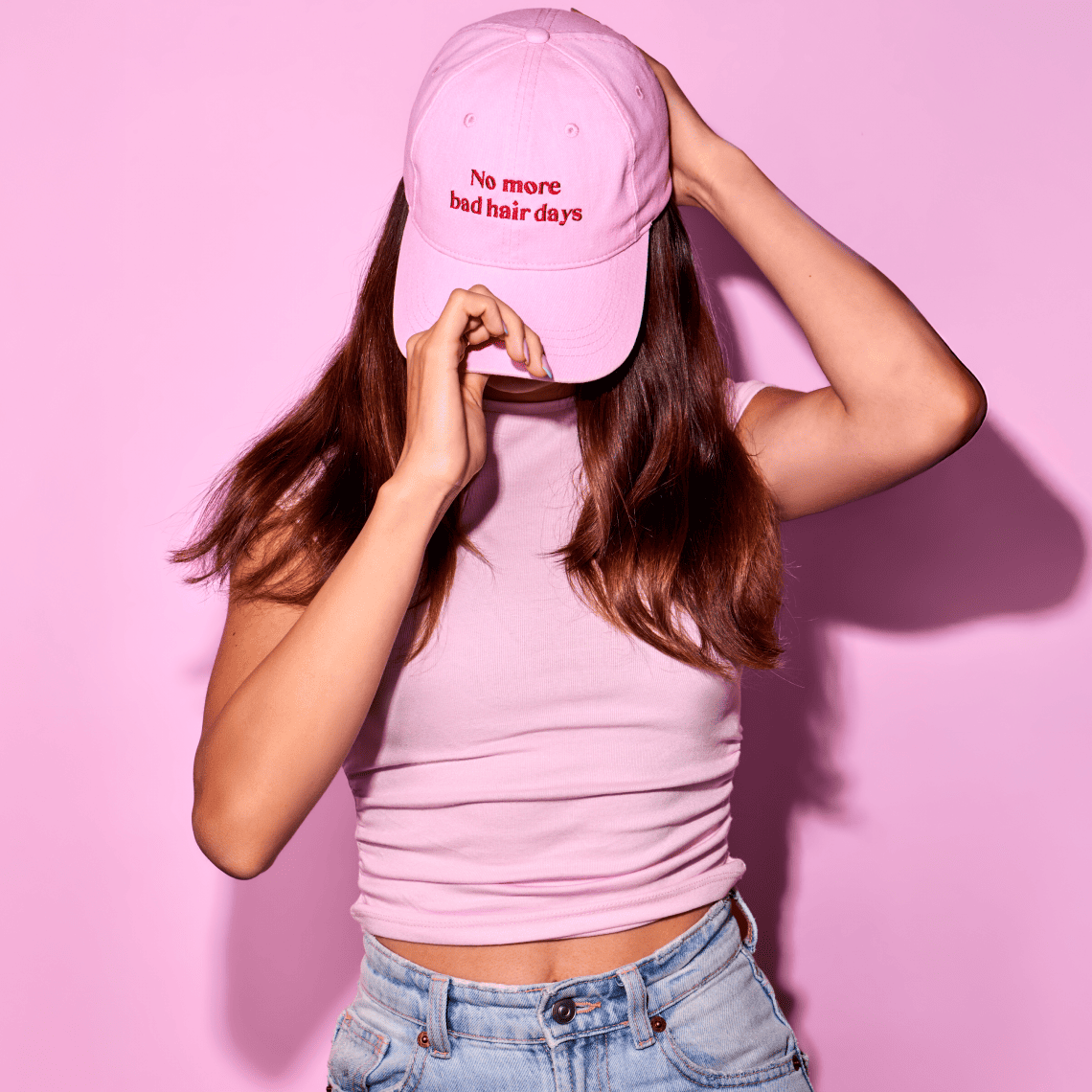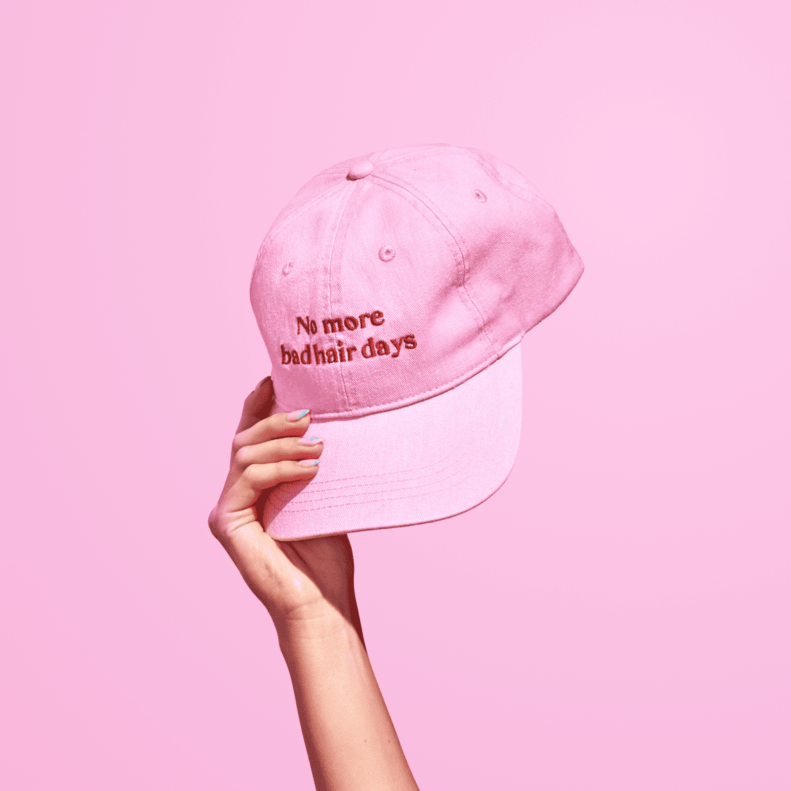 Our pink “No more bad hair days” cap is about to become your go-to accessory. It shields your hair from the sun, adds a fun touch to any outfit and comes to the rescue on those not-so-great hair days.