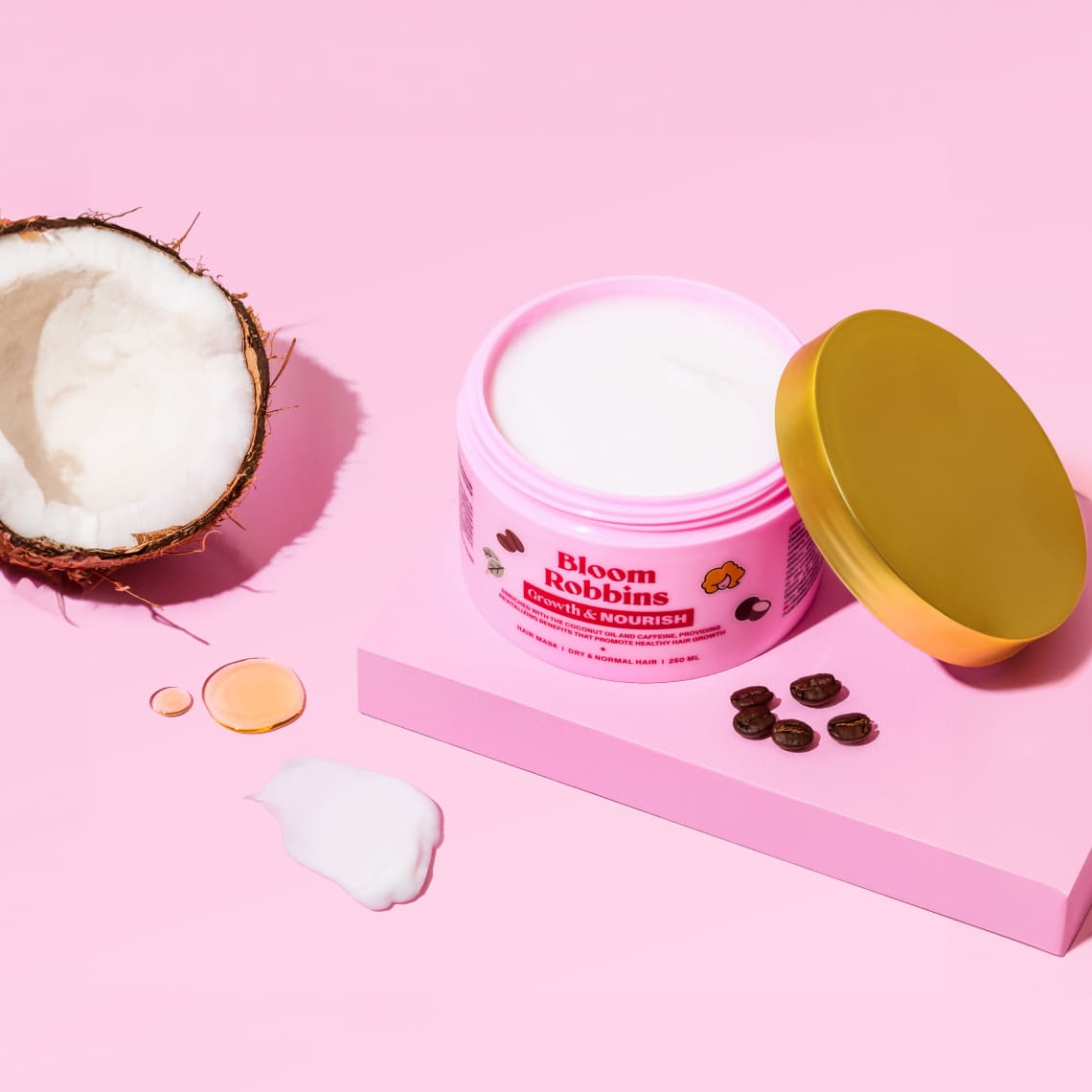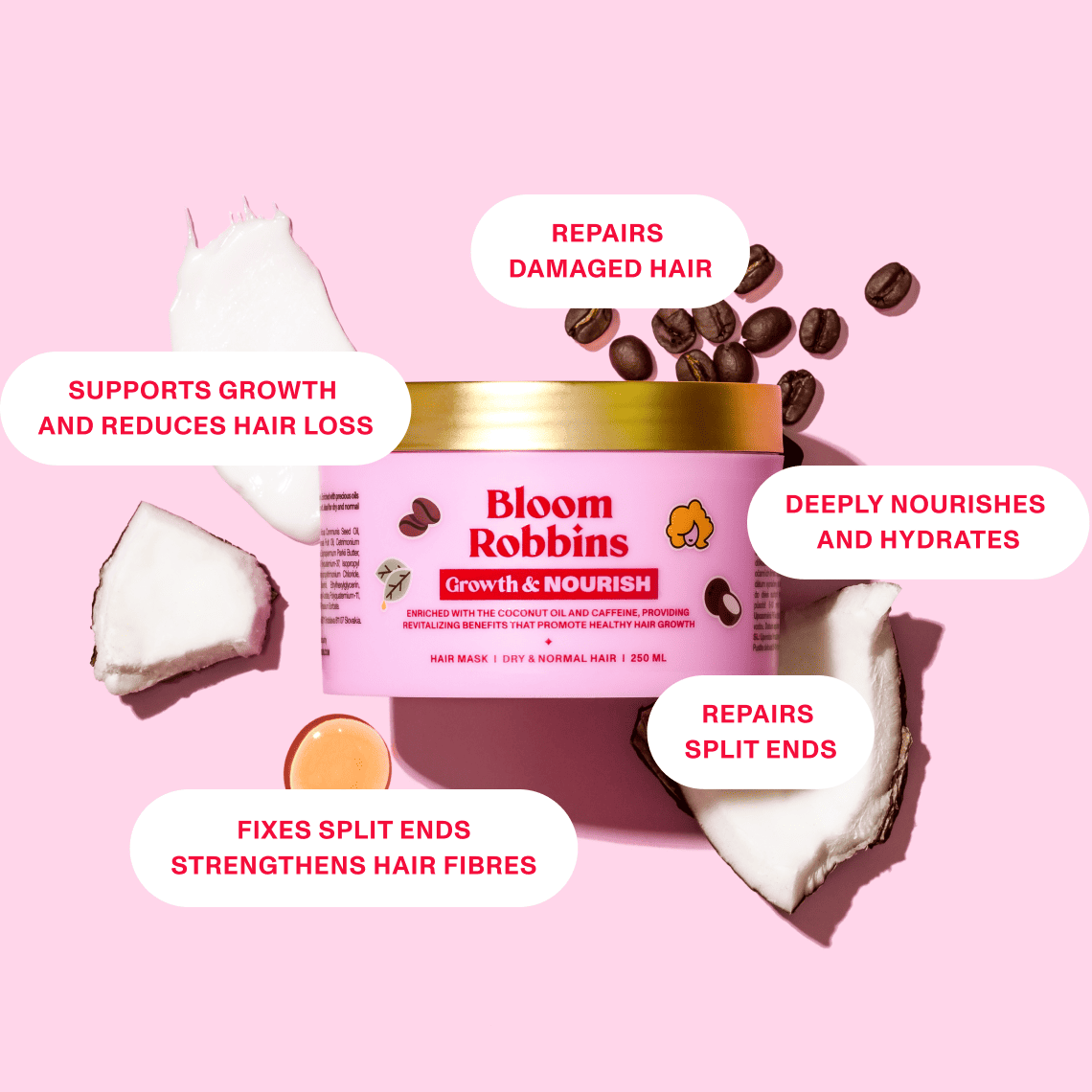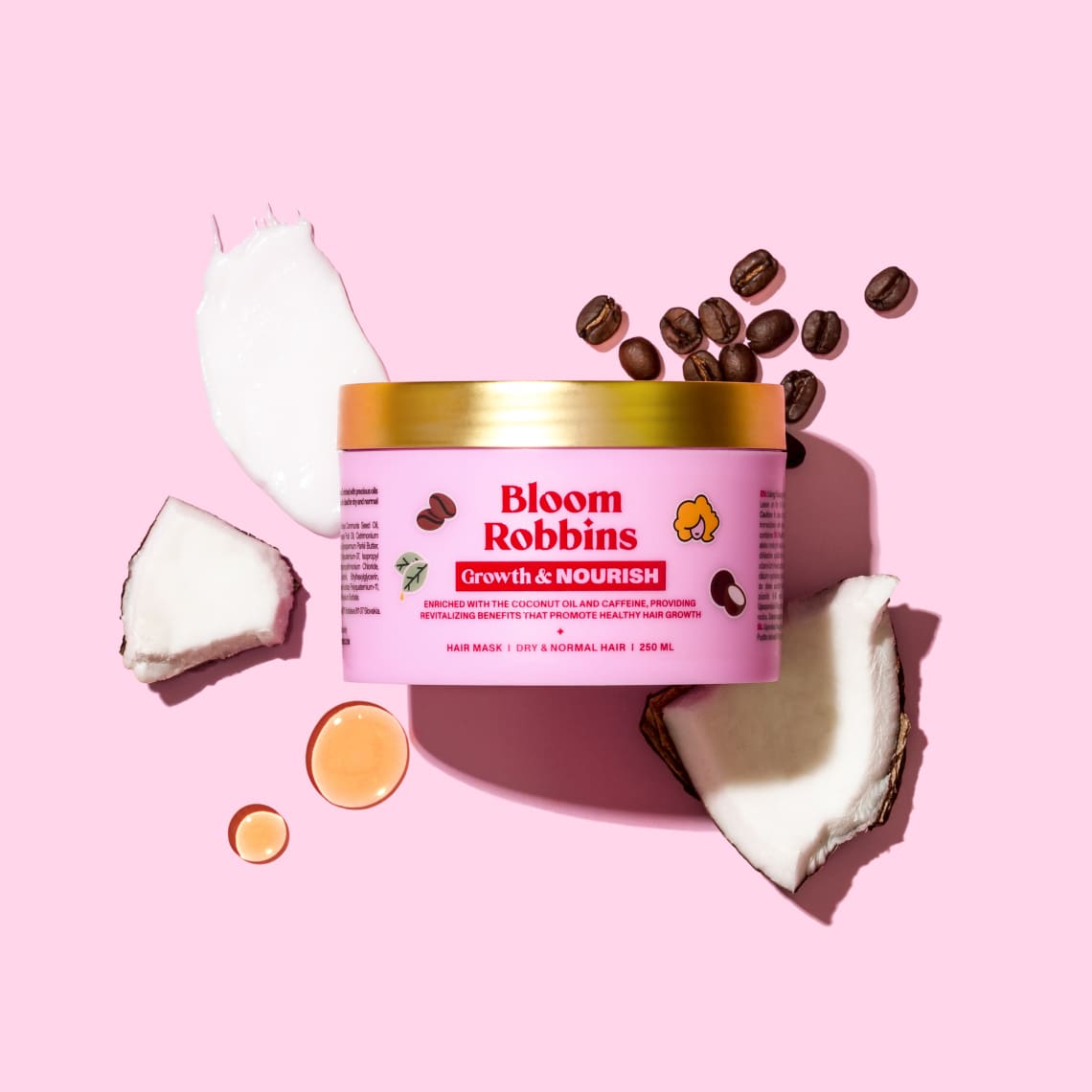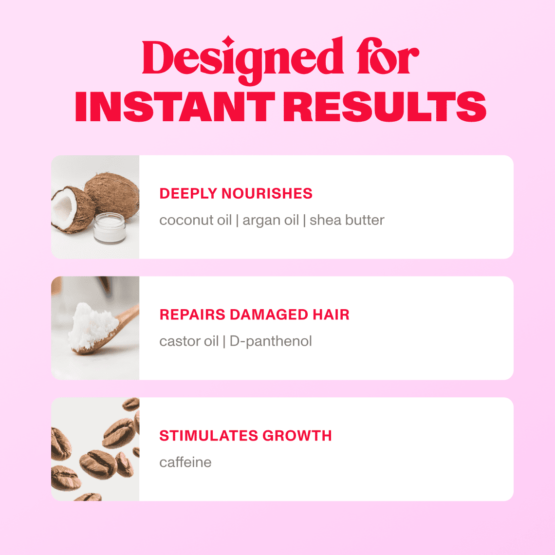 Coconut oil, Shea butter, Castor oil, Argan oil, D-panthenol, Caffeine