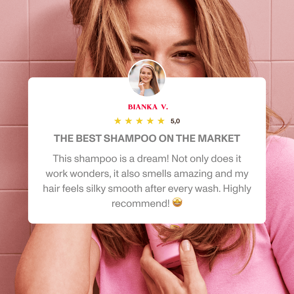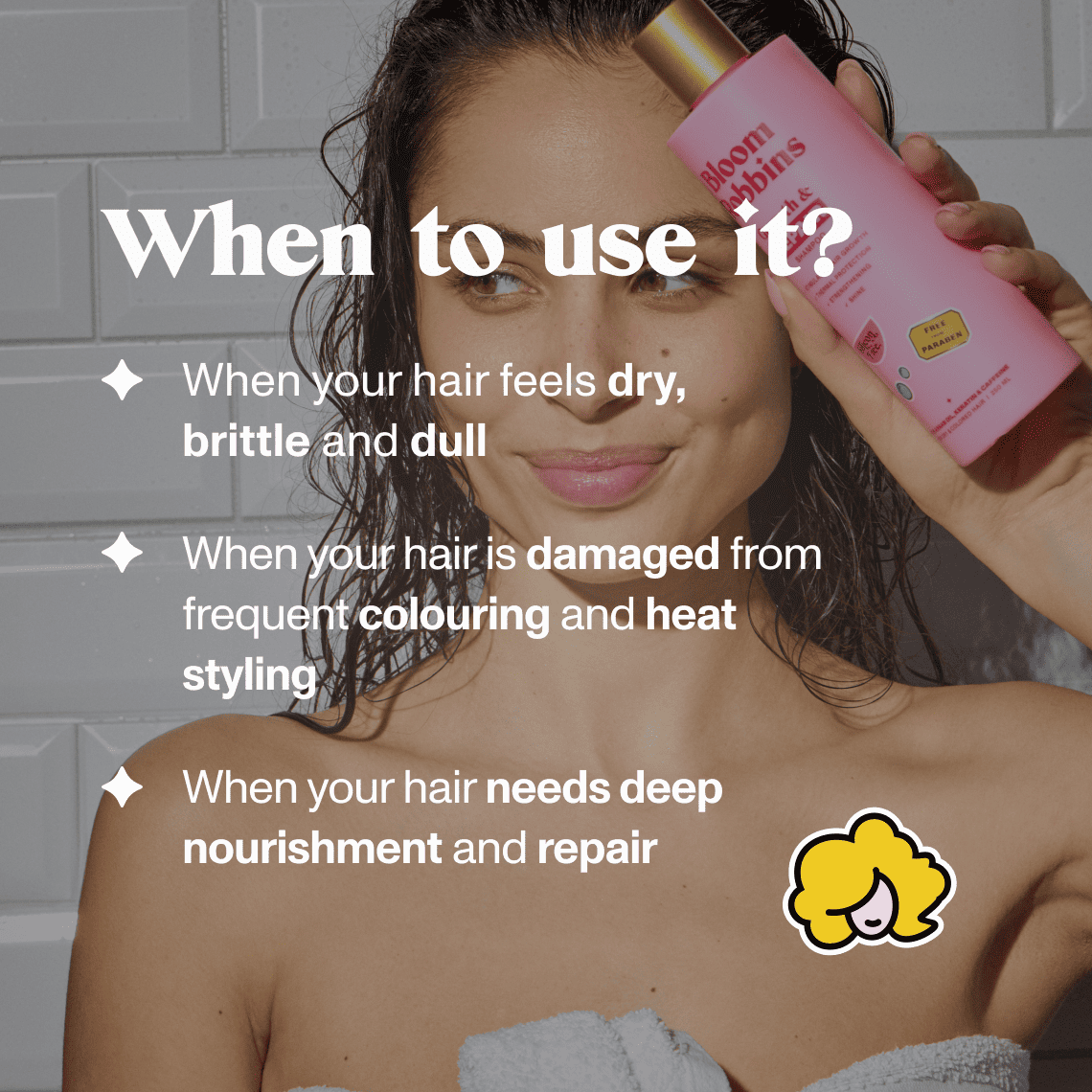 The shampoo is especially designed for colored, dry, and damaged hair, as well as hair that is regularly subjected to heat styling (blow-dryer, curling iron, straightener, etc.).